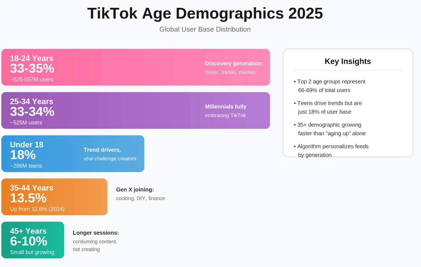 Overall, TikTok skews young, but not as young as one might think. In 2025, users aged 18 to 24 make up the largest single group at around of the platform’s total audience, around 33–35%. That’s roughly 525 to 557 million people globally.