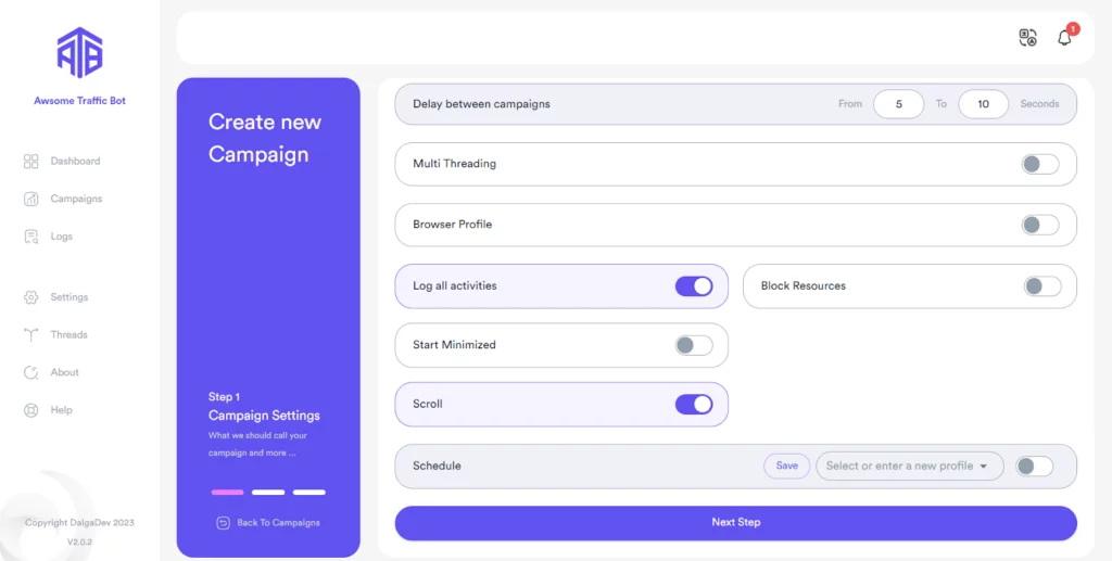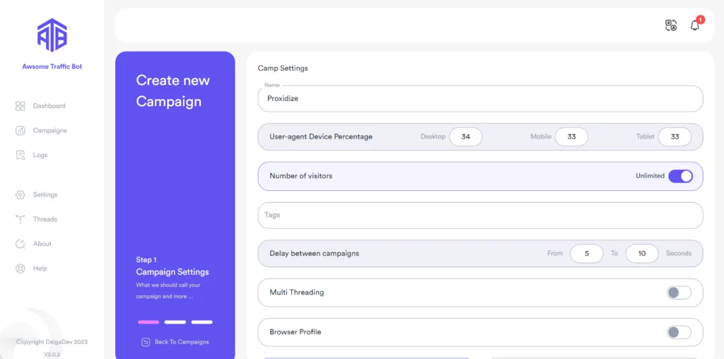 In this first step, you can name and customize your campaign based on your requirements, which includes creating browser profiles, multi-threads, campaign delays, and much more.
