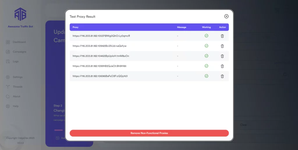 After adding your proxies to the ATB dashboard, it’s a good idea to test them out by clicking on the “Test Proxy” button on your dashboard. This step ensures everything is running smoothly before you dive into your CTR campaign. Taking the time to test your proxies ensures they’re reliable and ready for use. Once you’ve confirmed everything is working well, you’re good to go!